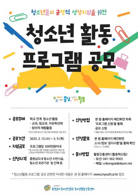 공모 기간은 3월 9일까지며, 충청남도청소년진흥원 홈페이지에서 온라인으로 신청할 수 있다.