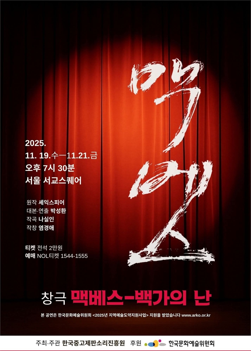 충청의 소리 중고제 명창 박성환 대표가 대본과 연출을 담당했다. 박성환 대표는 중고제 적벽가의 사실상 유일한 전승자로, 국립창극단 부수석을 역임한 창극 전문가다. 강도근·성우향에게 사사한 뒤 30여 편의 창극을 발표해 왔으며, 2013년부터 2023년까지 7차례에 걸친 중고제 적벽가 완창 기록을 보유하고 있다. 공연은 공주에서의 초연에 이어 서울 서교스퀘어에서 11월 19일부터 21일까지 이어진다. 시간은 오후 7시 30분. 이 공연은 한국문화예술위원회의 <2025년 지역예술도약지원사업>의 지원을 받아 진행된다.(전종호 기자)