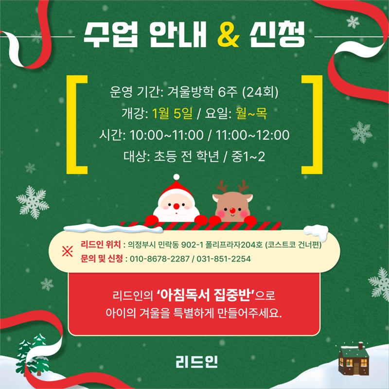 경기도 의정부 민락동 삼현초 인근에 위치한 리드인 민락삼현초점이 이번 겨울방학을 맞아 초등 전 학년과 중학생을 위한 문해력·독서 중심 겨울방학 특강 프로그램을 운영한다고 밝혔다.