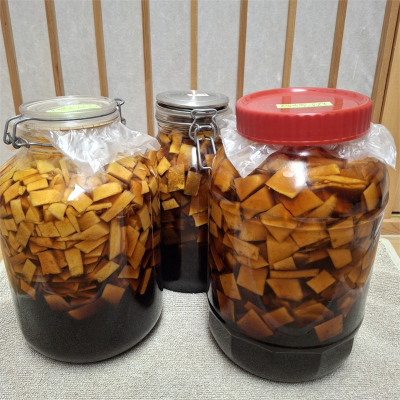 밖에서는 한바탕씩 흙장난(?)을 하고 안에서는 늙은 호박을 갈무리한다. 툇마루에 수확한 늙은 호박을 두었는데 그 옆에 우리 집으로 밥 먹으러 오는 ‘치즈냥이’가 앉아 있어 깜짝 놀란다. 색깔이 너무 비슷해서 ‘치즈냥이’보다는 ‘호박냥이’로 부르는 것이 맞춤해 보인다. 해마다 언니에게 늙은 호박으로 만든 호박 식초를 받아 썼다. 언니는 사서 만드셨지만 이제부터는 내가 수확한 호박으로 직접 만들어 나눔 하려고 레시피를 받았다. 샐러드 할 때, 여름철 차가운 음료로, 새콤달콤 찬을 만들 때 좋은 식초다. 식초를 양껏 만들었는데도 수확물이 남았다. 무엇을 만들까? 궁리를 한다. 호박 조청을 만들어 볼까? 이건 궁리가 아니라 도전이다.