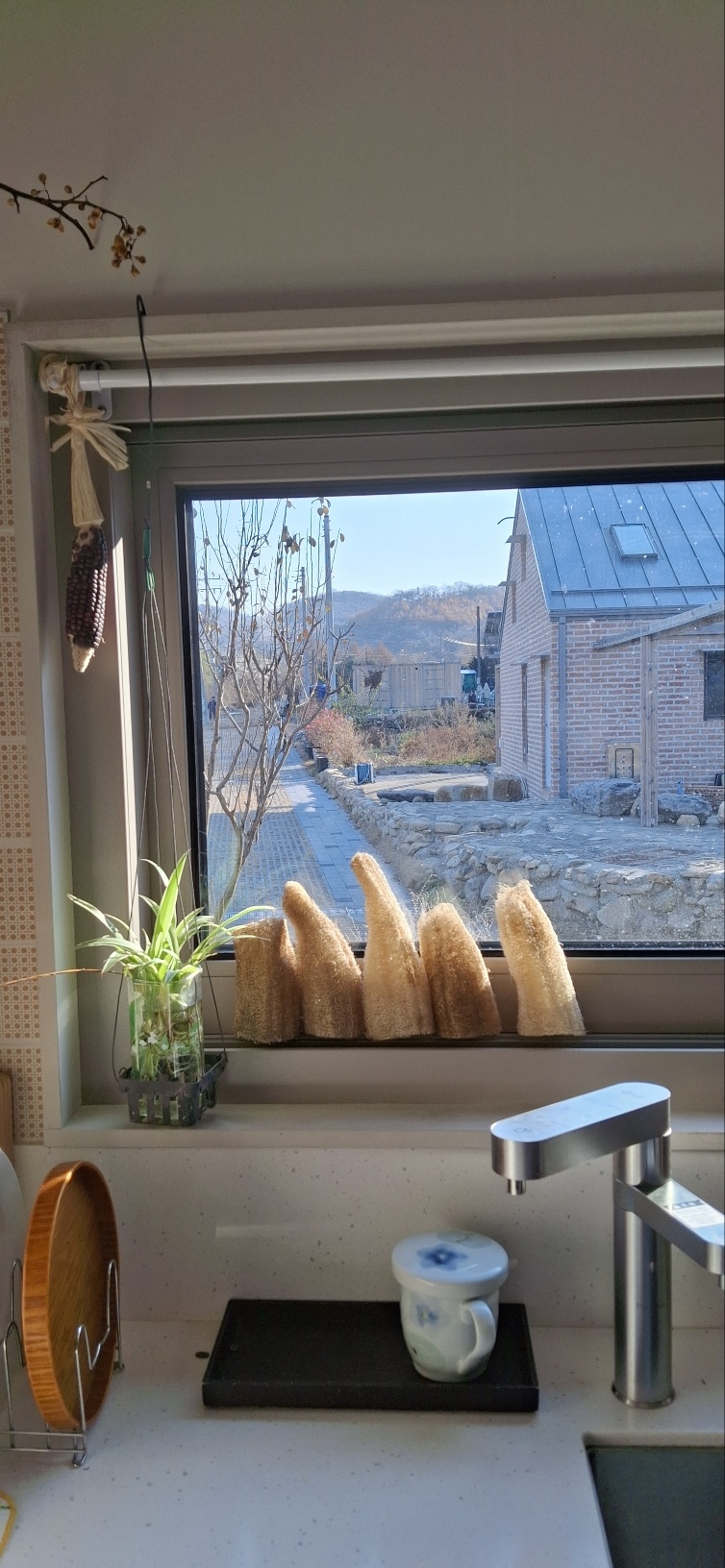 작은 땅에 작은 집을 지어 정원이랄 것도 없지만 그래도 여기저기 나무들을 심었다. 3년쯤 지나니 제법 자리를 잡아 꽃이 피고 단풍이 든다. 그러나 북쪽 현관 쪽에 심은 능소화와 아직 나이가 어린 모과나무, 별목련에게는 잠복소를 입혀 월동을 도와야 한다. 뿌리가 얼지 않도록 덮어주고 가지치기도 하며 옷을 입혀 준다. 눈이 오기 전에 해야 할 일들이다. 밖에서 이러한 갈무리를 하다 보니 유독 눈길이 닿는 장소가 있다. 작물을 심기에는 적절치 않아 비어있는 공간이다. 빈터를 만들면 자연이 뛰어들어 무섭게 일하기 시작한다더니 그곳은 매년 공격적으로 자라는 풀을 잡기에 힘만 드는 공간이다. 밭을 만들 때 캐낸 돌무더기가 눈에 들어온다. 돌담을 쌓아 조금 높은 화단을 만들면 좋겠다는 생각에 미친다. 날마다 조금씩 돌들을 옮기며 쌓아 작은 화단을 만들어 간다. 밖에서 이런저런 분주함으로 이웃이 준 수세미 두 개가 툇마루에 방치되어 있었는데 남편이 삶고 껍질을 벗겨 부엌 창틀에 세워 놓았다. 멋지다!(글 얼치기 농부 김상란)