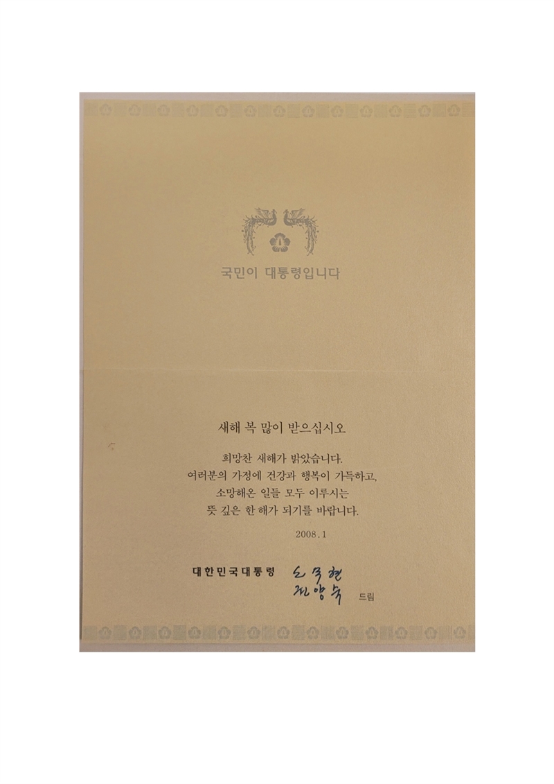 그렇다면 청와대에서 대통령들은 어땠을까? 청와대에서는 관저에서 설빔을 차려입고 가족들의 세배를 받기도 하고, 수석·비서관 등 참모진과 서로 맞절하며 새해 인사를 했다. 이승만 전 대통령 내외가 경무대에서 세배를 받고, 전 전대통령은 청와대에 어린이들을 초대해 세배를 받기도 하였다. 2000년 청와대 관저에서 직원들로부터 세배를 받는 김대중 전 대통령 부부의 모습도 기록 사진으로 남아있다. 대통령실 직원들로부터 세배를 받고 세뱃돈을 나눠 주기도 하였다. 새해를 맞이하여 청와대 관저 검식관으로 근무를 하면서 청와대 식구들이 대통령께 세배를 드리는 모습을 지켜본 적은 있지만 아쉽게도 대통령의 세뱃돈을 직접 받지는 못했다. 전두환 전 대통령에겐 봉투에 넣은 백만 원을 받았고, 노무현 전 대통령에게 현금 만 원을 받았다는 확인되지 않은 선배의 말을 기억한다. 새해를 맞이하여 청와대 직원들도 대통령 내외분에게 매년 연하장을 받았다. 나도 지금 보면 소중한 그 연하장을 어디에 두었는지 몇 장 밖에 찾을 수 없었다. 전두환 전 대통령은 세월이 흘러도 붓글씨로 쓴 사자성어로 연하장을 보내 주었다. 2000년에 집 주소로 보내 준 붓글씨 ‘천상운집’인데 온갖 복된 일들이 구름처럼 몰려오기를 바랐으니, 나 또한 경호관으로 소임을 다했던 백담사에서의 연을 잊을 수 없다. 어느 날 ‘전두환 회고록’을 우편으로 받은 이 후 연하장은 더 이상 오지 않았다.
