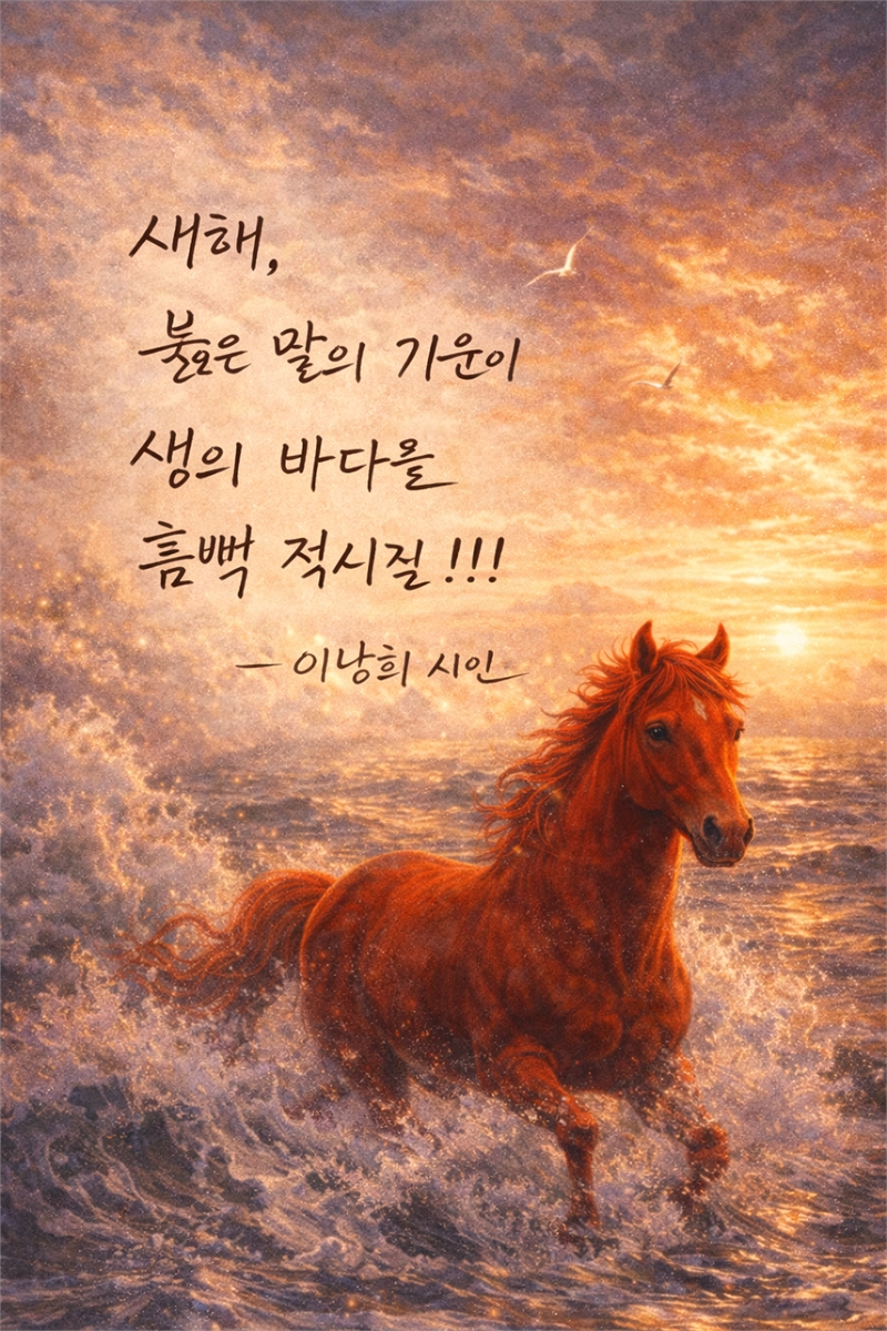 문화예술 이낭희의 '길 위의 인문학', 신년인사, 새해 첫사랑 중앙교육신문 승인 2026.01.12 07:27 | 최종 수정 2026.01.12 07:35 0 어둠의 바다를 뚫고 온 불은 말이 뜨거운 함성, 불꽃같은 사랑이 품에서 흘러 새해 첫 사랑으로 첫 페이지를 물들이나니 함께하는 시간도 함께나눌 공간도 마주하게 될 누구와도 능히 세상을 밝히는 나만의 문장으로 이 푸른 지구별 어딘가 우리의 푸른 언덕에서 반짝이게 하소서 시 이낭희(행신고등학교 교장) 3 0 중앙교육신문 중앙교육신문 jclee63kr@naver.com 중앙교육신문의 기사 더보기 저작권자 ⓒ 중앙교육신문, 무단 전재 및 재배포 금지